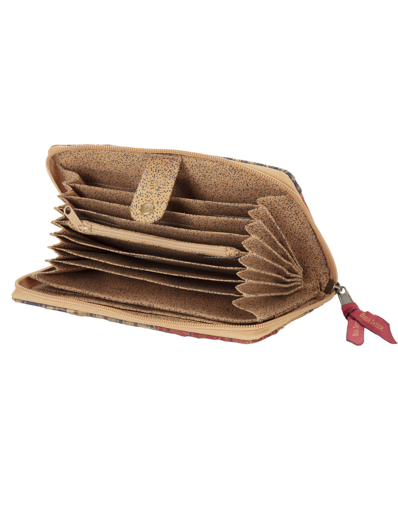 A brown leather wallet with multiple card slots and a red zipper closure is open, displaying the contents. | Bella Taylor Cash System Wallet V2 - Millsboro | 07668644ddc1b5483d8b9f61f71663d43c555038402dcab42a54394f19ce437b | 000910692767 | 0 | 0 | 18 | 8 | 0 | 0 | |