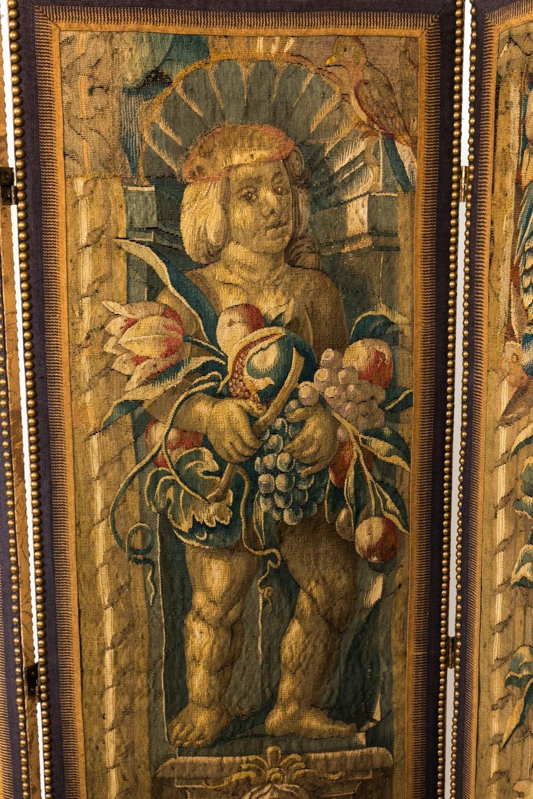 A detailed illustration of a cherub holding a bunch of grapes, surrounded by various fruits and flowers, with a decorative border featuring birds and foliage. | 18th Century Three Panel Flemish Tapestry Screen For Sale 7 | 6e6defe2096dbb0d9cacb38de0329b6e64f6900205333df9a9a61d36d611a53f | 000910693049 | 0 | 0 | 25 | 10 | 0 | 0 | |