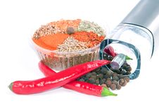 A close-up image of a variety of spices and peppers. There is a clear plastic container filled with a mix of spices, including what appears to be paprika, cumin, and coriander, among others. Next to the container, there are two red peppers, one of which is sliced in half, revealing its seeds and inner flesh. In the foreground, there is a small pile of black peppercorns. The image is well-lit, with a white background that highlights the colors and textures of the spices and peppers. | Free Nice Differnet Spicery Set And Saltcellar Royalty Free Stock Image - 16194466 | d5ae675d75cc95c4a252b4841d6f40c4c4d350ad3ce87b4855135efb1df888ce | 000910693113 | 0 | 0 | 85 | 13 | 0 | 0 | |