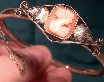 A close-up image of a person's hand holding a silver bracelet with a large, ornate, oval-shaped gemstone in the center. The gemstone has a pinkish hue with white and gold accents. The bracelet features intricate designs and is adorned with smaller gemstones and leaves. The background is a soft, blurred green. | Sterling Silver Cameo BANGLE BRACELET 1900 1920 | affc3c3cc8069eb699eaf73e454d48f9871f0201b91f8c10e0c39718ea3035ef | 000910693028 | 0 | 0 | 51 | 7 | 0 | 0 | |