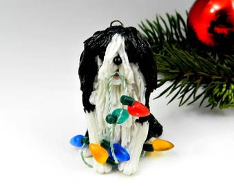 A black and white dog ornament with a sad expression is hanging from a string of colorful Christmas lights. The ornament is placed on a white surface with a green pine branch in the background. A red Christmas ornament is visible on the pine branch. | Havanese Black White Christmas Ornament Figurine Lights Porcelain | 27313f88748c48ff1f42d05281e5ac9d6e82c14d23e7415f231948d72d4efaa8 | 000910693050 | 0 | 0 | 45 | 8 | 0 | 0 | |