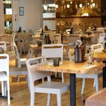 A spacious restaurant interior with multiple dining tables and chairs. The tables are set with various condiments, glasses, and cutlery. The chairs are white with wooden legs, and the tables have a wooden finish. The restaurant has a modern design with pendant lights hanging from the ceiling. The floor is wooden, and the walls are adorned with framed pictures and shelves with bottles. | photo of zizzi - kenilworth restaurant | 240e471c405100136836d34b267636192ddf7b97117774879b59d0eeabfa7e30 | 000910693015 | 0 | 0 | 63 | 6 | 0 | 0 | |