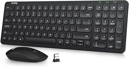 A black wireless keyboard with a USB receiver and a black wireless mouse are placed on a white surface. | VicTsing Wireless Keyboard and Mouse Combo Black Windows Stylish Full-Size Keyboard and Quiet Mouse 2.4GHz Wireless Connection with USB Receiver for Desktop Computer Laptop PC | 07d087c55a6aba52e609013860b8e75ebd8dedc6f23ded4e4335e683776a0d49 | 000910693279 | 0 | 0 | 19 | 25 | 0 | 0 | |