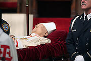 A person dressed in a white papal robe with a red sash is lying on a red velvet coffin. The individual is wearing a white mitre and has a rosary around their neck. A police officer in a black uniform with a badge and a tie is standing to the right of the coffin, looking down at the person. The scene appears to be taking place in a church or a similar religious setting. | March 10, 2015 - New York, NY. The funeral of former Cardinal Edward Egan was held at St. Patrick's Cathderal on March 10. Those in attendance included Governor Cuomo and Mayor de Blasio 2/10/2015 Photo By Paul Liotta/ NY City Photo Wire | 43ceb7e5a7d83231d747699c57611dedd4fa467d7558267c6fc33d8c39eca28d | 000910693315 | 0 | 0 | 74 | 42 | 0 | 0 | |