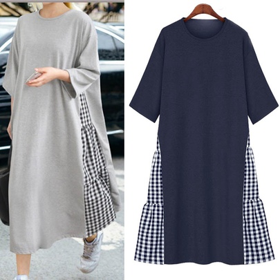 A woman is wearing a long, grey coat with a checkered pattern on the bottom half, paired with white sneakers. She is holding a black handbag and is standing on a street with cars in the background. | Loose Plaid Stitching Short-sleeved Long Dress NSLIB55510 | c64dc940cdf84d182402eb3b7aae6e8cb0514474585a1ee80fd1157d48961f3f | 000910693688 | 0 | 0 | 37 | 7 | 0 | 0 | |