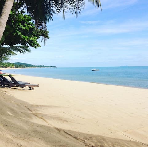 A sandy beach with a few lounge chairs and a boat in the distance under a clear blue sky. | Baan Fah Resort | 27f0819294e3defd19c158107074a0c1807198e62534a462cf084dacca93c1a0 | 000910694253 | 0 | 0 | 19 | 3 | 0 | 0 | |