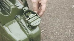 A hand is holding a green object with a metallic part on the side. The object appears to be a piece of luggage or a container. The hand is positioned in such a way that the fingers are curled around the object, and the thumb is on top of it. The background is a blurred area with a hint of a road or pavement. | Man opens gas petrol or diesel jerry can with fuel - stock footage | 2c2d483984c2999d0f9efd8bcec77f3934edeb13e77f40306437219cf9552677 | 000910694239 | 0 | 0 | 64 | 13 | 0 | 0 | |