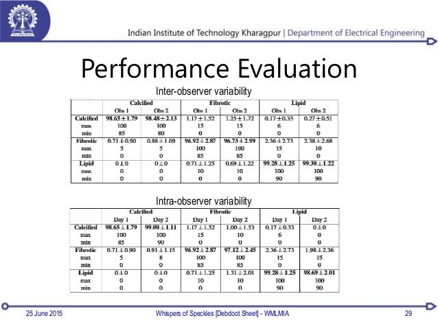 A table with two columns of data, labeled 'Interobserver Variability' and 'Intraobserver Variability', with rows of numbers and percentages. The table is titled 'Performance Evaluation' and is part of a larger document with a header that reads 'INDIAN INSTITUTE OF TECHNOLOGY Kharagpur DEPARTMENT OF ELECTRICAL ENGINEERING'. The document appears to be a report or study on performance evaluation. | Performance Evaluation\n25 June 2015 29\nInter-observer variability\nIntra-observer variability\nWhispers of Speckles [Debdoot... | 1cd411eed711d822a8e319ef7fe7431109c11ed7c0cc22f8d91841138d270fef | 000910694233 | 0 | 0 | 58 | 10 | 0 | 0 | |