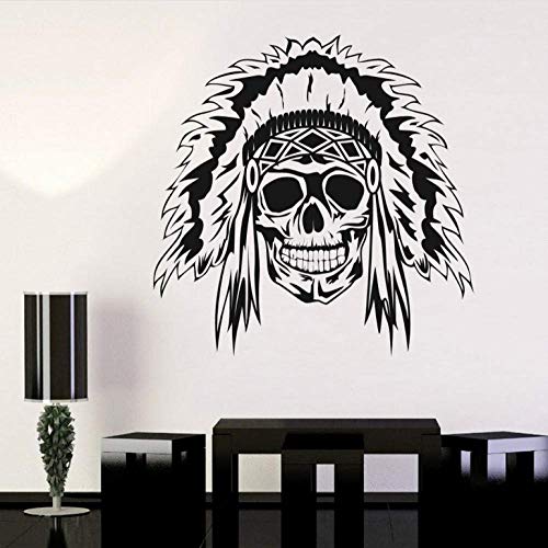 A black and white skull with a feathered headdress is painted on a white wall. The skull is adorned with a cross-like pattern on its forehead and a necklace around its neck. The headdress is stylized with feathers and a central feather pointing upwards. The room has a modern aesthetic with a black coffee table, a black floor lamp, and a black vase with greenery on a small table. | Etiqueta De La Pared Indian Chief Skull Halloween Poker Sticker Decal Devil Name Car Art Tatuajes De Pared Decoraci\xc3\xb3n Mural 80X81Cm | b43a7b43b0a7b177d8ad005d04c8a53b0bec034b010cb9fb0693a4a9b4c213a8 | 000910694252 | 0 | 0 | 69 | 21 | 0 | 0 | |