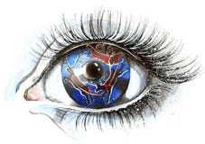 The second image is a close-up of a human eye with a detailed iris that has a blue and red pattern. The eye is surrounded by eyelashes and is set against a white background. The iris has a central black pupil and is surrounded by a blue ring with red and white patterns. The eye appears to be looking upwards, and the eyelashes are fanned out to the sides. | Abstract eye stock illustration | 5acfe8a25df95e1aed19655693f51150003b63ed4a4f9fa4651db814d5240bc9 | 000910694274 | 0 | 0 | 69 | 4 | 0 | 0 | |
