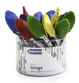 A set of colorful plastic kitchen utensils, including spoons and spatulas, is neatly arranged in a clear plastic container with a white label. The utensils are in various colors such as red, blue, green, yellow, and purple. The label reads 'DANESCO MINI TONGS 200\xc2\xb0C 500\xc2\xb0F FREEZER SAFE'. | Danesco Mini Tongs, Asst\xe2\x80\x99d Colours | b88adfebb4e78651219362cc789149a25f6db616ab61032affc92806fc69525c | 000910694367 | 0 | 0 | 47 | 5 | 0 | 0 | |