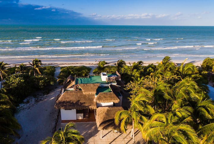 Aerial view of a tropical beach with a thatched-roof house surrounded by lush green palm trees. The ocean is calm with gentle waves, and the sky is partly cloudy. | Casa Andromeda, FULL HOUSE, 6 BEDROOMS. El Cuyo | 50f43c22cd9da5a69cde2c561e2c2cd84e731d59a3e6d9c31de3486f998aa4b8 | 000910685782 | 0 | 0 | 29 | 8 | 0 | 0 | |