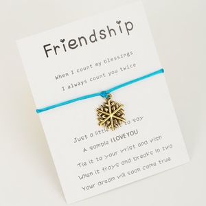 A white card with the word 'Friendship' written in black at the top. Below the word, there is a poem that reads: 'When I count my blessings twice, I always count you twice. I always count my blessings twice, I always count you twice.' The poem is accompanied by a blue bracelet with a golden snowflake charm. The card also includes a message that says: 'Just a little love you. A sample of your wrist and break it true. It's to your frays and soon come true. When it's a dream you'll soon come true. Your dream will soon come true.' | Jewelry - Sky Blue Rope Gold Snowflake Charm Bracelet & Card | a29ee7a7cf79fb96e8090a612d161de0ec0e9948eaab894e76f8c3054770f91c | 000910685824 | 0 | 0 | 101 | 11 | 0 | 0 | |