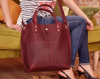 A person is sitting on a green couch with a maroon leather bag on their lap. The bag has a zipper closure and two gold-tone metal clasps. The person is wearing a striped shirt, blue jeans, and black sandals. The background shows a brick wall and a yellow pillow. | Large leather shopper bag, Large tote, Claret leather bag, Women leather tote, Leather shoulder bag, Leather tote, Leather Crossbody bag | 44f87b020a8756d2836cf3184209638aa7fcbf6986418f1c0622896862b504ac | 000910685856 | 0 | 0 | 49 | 20 | 0 | 0 | |