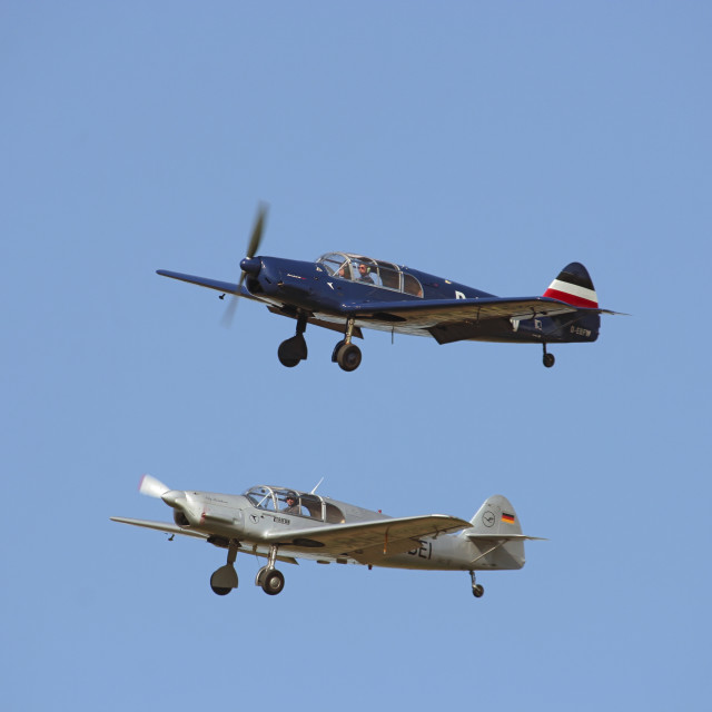 Two small propeller planes are flying in the sky. The first plane is positioned on the left side of the image, and the second plane is on the right side. Both planes have a similar design with a blue and white color scheme, and they are flying at a relatively low altitude. The sky is clear and blue, and the planes are in the same orientation, suggesting they are flying in the same direction. | "Historic aircraft, Messerschmitt ME 108 Taifun, two of the world\'s three existing machines flying in formation" stock image | 9e18295f832c9ce7a7de59599614e2b750757fdedf2805e23403f449fe79b822 | 000910685776 | 0 | 0 | 74 | 18 | 0 | 0 | |