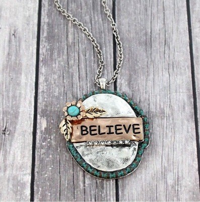 A silver pendant with a turquoise gemstone and a chain is displayed against a wooden background. | 'BELIEVE' NECKLACE Multi-tone | 285e055fe2cfcd2b03b1ee314212d10e607241a313077d9b8773df688411be00 | 000910695182 | 0 | 0 | 16 | 3 | 0 | 0 | |