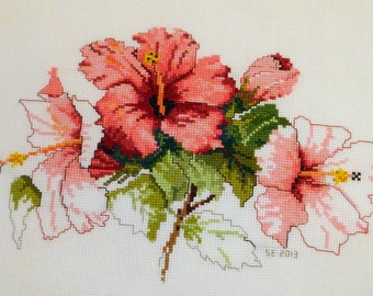 A close-up of a cross-stitch embroidery piece featuring a bouquet of pink and red flowers with green leaves. The embroidery is detailed with a variety of stitches, and the background is a plain white fabric. The piece is signed 'SE 2009' in the bottom right corner. | Embroidered Cross Stitch Hibiscus Flower Sampler (not framed) | 86241e22ef05109106f10a76b3bacca6aa7471ef06d5c306a148fffbea9c0747 | 000910695266 | 0 | 0 | 46 | 8 | 0 | 0 | |