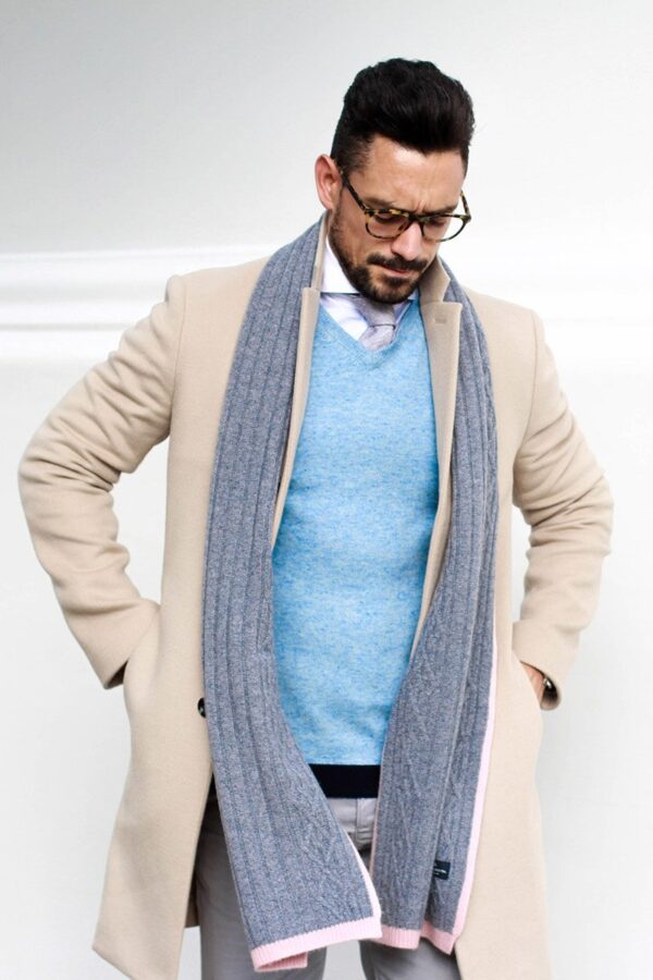 A man is wearing a beige coat, a blue sweater, and a grey scarf with pink stripes. | Ludlow V Neck Sweater In Melange Blue | 3b2f4596ada83f4fae0778e265078c7928ccae409a11238f54d4c448a4a38891 | 000910695210 | 0 | 0 | 17 | 7 | 0 | 0 |