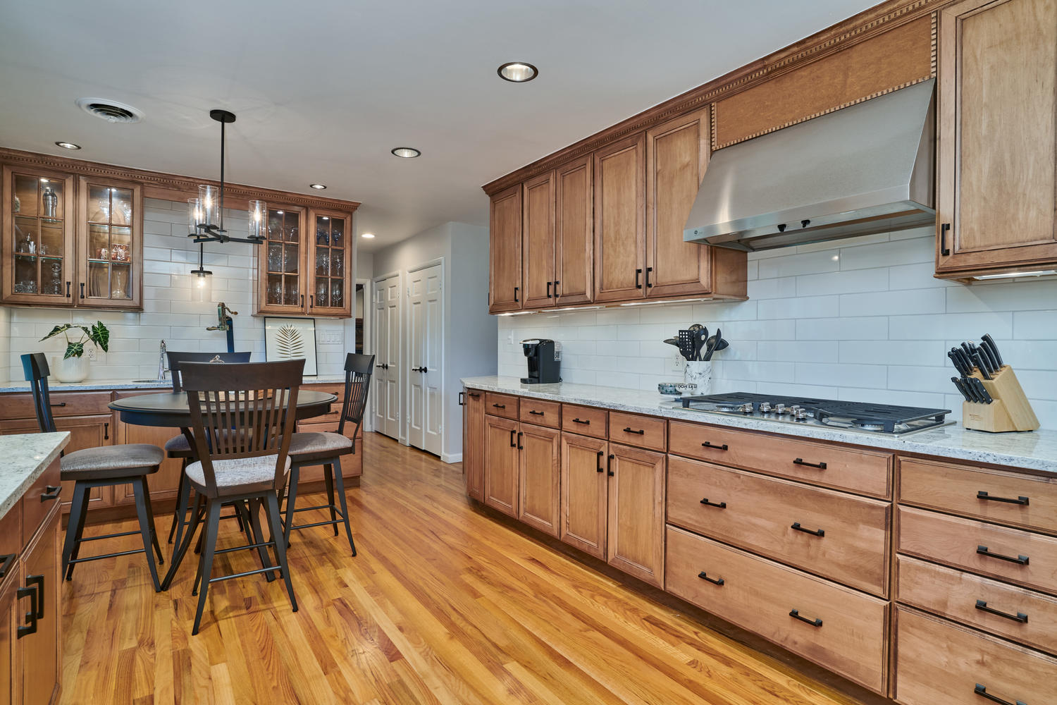 A spacious kitchen with wooden cabinets, a white tiled backsplash, and a wooden floor. The kitchen features a central island with a black bar stool, a wooden dining table with four chairs, and a stove with a pot on it. There are various kitchen utensils and a coffee maker on the countertop. The room is well-lit with natural light coming from the windows and ceiling lights. | Abundant Cabinetry & Hardwood Floors in Kitchen | 19d991be529cc6d566cf1a2eeda8da4f46efac21b4d9740694ac4507223f60b1 | 000910695236 | 0 | 0 | 66 | 7 | 0 | 0 | |