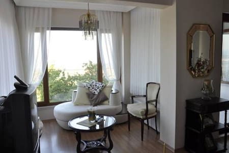 A cozy living room with a large window draped with white curtains, a beige sofa with a white cushion, a black coffee table with a glass top, a black chair with a beige cushion, a black side table with a vase and a small plant, a black TV stand with a flat-screen TV, and a black floor lamp with a gold stand. | Snow Hill House Apart Manolya Dairesi - Kartepe | d0bb426a5ebd37b746d4b48f0273a145fdbe0b6e9dd3b5d207afc65cdab0e50f | 000910695555 | 0 | 0 | 62 | 8 | 0 | 0 | |