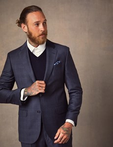 A man with a beard and tattoos on his arms is wearing a dark blue suit with a white shirt and a dark blue tie. He has a pocket square in his suit jacket pocket. | Men's Dark Blue Shadow Plaid Tailored Fit Italian Suit \xe2\x80\x93 1913 Collection | 83d7c531fa86b0e901b046317f90d3116a6cddf335ce327f9839042c19973ad6 | 000910697083 | 0 | 0 | 35 | 12 | 0 | 0 | |