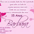 A pink invitation card with a floral design on the left side and the name 'Barbara' in a cursive script on the right side. The card has a message in Portuguese, which translates to 'Please come to celebrate Barbara's 15 years'. The card also includes a date and time, '2012 de 20/30', and a location, 'Planta 3, SP 3'. | Convite Aniversario Simples | 0fc29e4f8e29be103cbcb4fbfcaaef4a447e8d11c989fe1ff864fe0c6792b8f5 | 000910697140 | 0 | 0 | 59 | 3 | 0 | 0 | |