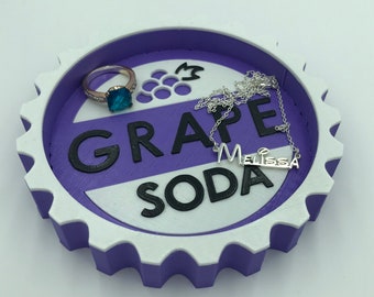 A purple ring with a blue gemstone and a silver ring with a heart-shaped pendant are placed on a white surface with the words 'GRAPE SODA' written in black. The rings are positioned as if they are floating above the surface. | Pixar Up Grape Soda Pin Ellie Badge Jewelry and Trinket Tray to hold rings, necklaces, bracelets, earrings, pins, etc. on vanity | cf48e2dbbfdb1aafc833298c6e85c770f77e21806e26923a7c5f27d95e0d5755 | 000910697268 | 0 | 0 | 41 | 21 | 0 | 0 | |