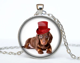 A small brown dachshund dog wearing a red top hat and glasses is sitting on a white surface. The dog is inside a circular frame with a silver chain attached to it. The background is a plain white color. | Steampunk dog necklace dog Steampunk dog pendant Steampunk dog jewelry | c11976887f305e95459ade2d984294a1e80cb04fbc709edbbe4283c38e833f7e | 001065743869 | 0 | 0 | 39 | 10 | 0 | 0 | |