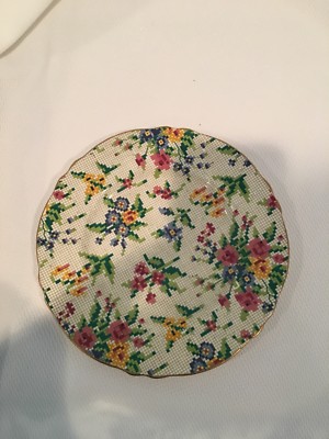 A close-up view of a floral-patterned tablecloth with a circular design in the center. The tablecloth has a textured surface with a variety of flowers and leaves in shades of yellow, pink, blue, and green. The circular design features a denser arrangement of flowers and leaves, with a prominent yellow flower in the center. The tablecloth is placed on a surface that appears to be white, and the lighting casts a soft shadow to the right of the circular design. | Chintz Grimwades Royal Winton Queen Anne Cake Plate 7 Inch Scalloped Edge | 89fe8d0265978623695079721f71300320732d7141c59249413faf9fae1bf259 | 001065743894 | 0 | 0 | 80 | 12 | 0 | 0 | |