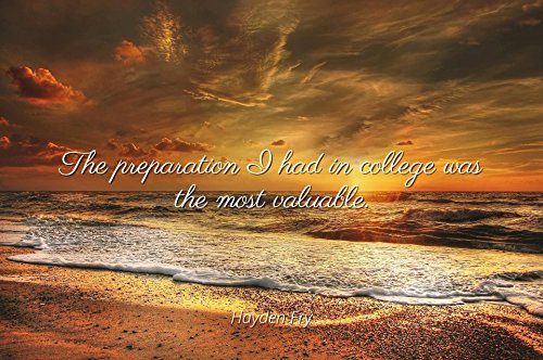 A serene beach scene at sunset with a quote overlay that reads 'The preparation I had in college was the most valuable.' The quote is in a cursive font and is positioned in the upper left quadrant of the image. The sky is filled with warm hues of orange and yellow, and the sun is visible near the horizon, casting a soft glow on the water. The waves gently lap onto the sandy shore, and the overall atmosphere is one of calm and reflection. | Home Comforts Framed Art for Your Wall Hayden Fry - Famous Quotes Poster Print in a 10x13 Frame - The Preparation I had in College was The Most Valuable. by Home Comforts (Image #4) | 494180b7e60dcaf13ce466085d8744ea6269be66cffe04a1b3a5754de73e725f | 001065756220 | 0 | 0 | 84 | 34 | 0 | 0 | |