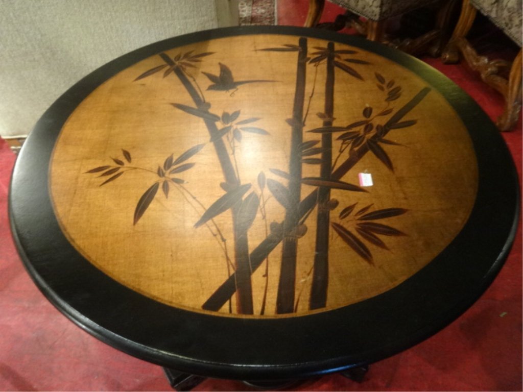A round wooden table with a bamboo design carved into its surface. The table has a black rim and is placed on a red floor. There is a small white tag with a red border on the table, partially obscured by the bamboo design. | BLACK AND GOLD FINISH PEDESTAL TABLE, PAINTED BAMBOO - 2 | af33da411c570176b9d62e18872cb10769d5cfaa81f6709c897180bde6a440d4 | 001065756219 | 0 | 0 | 44 | 10 | 0 | 0 | |