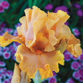 A close-up of a yellow and orange iris flower with a dark orange center, surrounded by green foliage and pink flowers in the background. | Cordoba Reblooming Bearded Iris | b09cb3e580e32405cd150f0d420d14b878031ba09b394bbac783116e4c97430d | 001065756106 | 0 | 0 | 24 | 4 | 0 | 0 | |