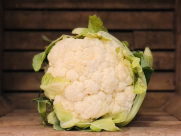 A close-up of a large, white cauliflower with green leaves, set against a wooden background with vertical planks. | 1 - White Cauliflower | b7bb3e74372cd6112d2903b49c2e16edf5be11377f9a12804b5137658de519eb | 001065756181 | 0 | 0 | 18 | 4 | 0 | 0 | |