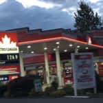 A Canadian Tire gas station at night with a cloudy sky. The station has a red and white color scheme with a prominent Canadian flag on the side. There are multiple gas pumps with bright lights illuminating the area. A large sign with the price of gas is visible on the left side of the station. The building has a flat roof with a slight overhang, and there are trees in the background. | View Petro-Canada\xe2\x80\x99s Maple Ridge profile | 0ed1af9e49e8505bbbf4c1113d5181ce7c0cc9d09d74f95131b6ec8c30347cd3 | 001065756096 | 0 | 0 | 73 | 5 | 0 | 0 | |