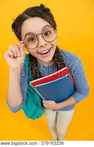 A young girl with glasses is holding a red and blue notebook in her right hand and a green backpack in her left hand. She is wearing a blue shirt, beige pants, and has her hair tied up in a ponytail. | School Student Small Girl Going To School Knowledge Day, Glad To See You Concept. | bed9265d2658107c0434955c07b7838094cae3712caec56bfad1db737d69e2c5 | 001065756152 | 0 | 0 | 41 | 14 | 0 | 0 | |