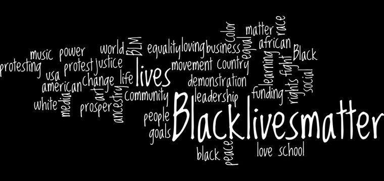 The second image is a word cloud that reads 'BLACKLIVESMATTER' in large, bold letters at the bottom. The cloud is composed of various words and phrases related to the Black Lives Matter movement, such as 'power', 'justice', 'equality','movement', 'change', 'leadership', 'peace', 'love','school', and 'rights'. The words are arranged in a way that creates a visual representation of the movement's themes and goals. The background is a solid black color, which contrasts with the white text and highlights the words in the cloud. | Black Lives Matter wordcloud Illustration. | c69b8bce84cc543b1ff851cee1412324dc042ba590b8c548b8149806f62fccf4 | 001065756141 | 0 | 0 | 82 | 5 | 0 | 0 | |