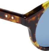 A close-up of a pair of sunglasses with a blue tinted lens and a brown frame featuring a tortoiseshell pattern. The sunglasses have a distinctive shape with a curved brow bar and a hinge at the top. The frame is detailed with a series of small holes and a visible screw at the hinge. | Thom Browne Round-Frame Acetate Sunglasses | 61a4e9abdb6ba1b96778dfd652337855d4dd34ab518f66eb6d111d35bc1471e3 | 001065743990 | 0 | 0 | 54 | 5 | 0 | 0 | |