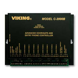 A black electronic circuit board with gold text and markings is displayed. The board has a label on top that reads 'Viking' and 'Model C-2000B'. Below the label, there is a list of text and symbols, including 'Advanced Door/Gate and Entry Phone Controller'. The board also has a series of small holes and a green circuit board underneath. | Viking C-2000B Door Entry Controller | 83ef4ad771fab46c23023d427500bf0484fb6efd87f736cc64cd053c2a1f8447 | 001065744031 | 0 | 0 | 58 | 5 | 0 | 0 | |