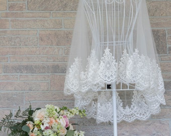 A white wedding dress with lace details is displayed on a mannequin, which is positioned in front of a stone wall. The dress is adorned with a long lace veil that drapes down to the floor. To the left of the mannequin, there is a bouquet of flowers with various colors, including pink, white, and yellow, arranged in a vase. | Tulle Lace Cape, Bridal Lace Cape, Bridal Capelet, Wedding Capelet, Wedding Cape, Lace Wedding Cape, Custom Bridal Cape. #B01B | f7dabd2262b1e8b506880fb7e9618fafa032a6bbe1528ea09c9e53eda6a8cad4 | 001065757707 | 0 | 0 | 60 | 19 | 0 | 0 | |
