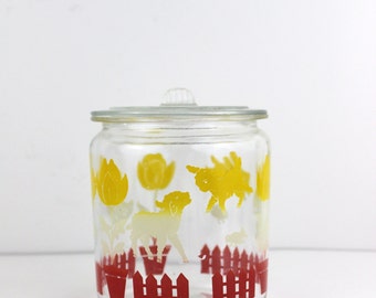 A clear glass jar with a red and yellow lid, containing a colorful illustration of various animals and a fence on the inside. The animals include a cow, a horse, and a bird, among others. The jar is placed on a white surface. | Vintage Candy Jar Cookie Jar Spring/Easter Jar | 87012824f0ae8f99a57791444be3094a93722126f4afc16607cc22ef645f106b | 001065757581 | 0 | 0 | 43 | 7 | 0 | 0 | |