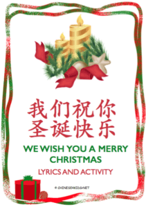 A festive holiday card with a red and green border. In the center, there is a red bow tied around a green wreath with pine needles and a golden candle. Above the wreath, there is a stack of golden gifts. Below the wreath, there is a red bow tied around a green ribbon. The card has Chinese characters on it, and the phrase 'We wish you a Merry Christmas' is written in English at the bottom. | We wish you a merry Christmas Chinese Christmas song lyrics and worksheets - learn Chinese children's song with various activity worksheets #Chinese4kids #ChristmasinChinese #LearnChristmassonginChinese #Chinesesong #Christmas #Chineseforkids | 44b8d06c2fb7ea0ccfff367bfe8a52489e4b4c880ef5a89d75ac239bad03b509 | 001065757577 | 0 | 0 | 76 | 27 | 0 | 0 | |