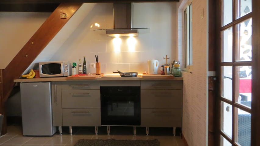 A compact kitchen with a refrigerator, microwave, and a stove with a pan on it. There are various bottles and a banana on the countertop. The kitchen has a window, a wooden ceiling, and a tiled floor. | Luxury Cottage, Gite in Gargilesse - Badecon-le-Pin | cd3cd43a775ec8728dd381df04a7797277a2b23830154a70a9c9a02777d63650 | 001229695706 | 0 | 0 | 37 | 7 | 0 | 0 | |