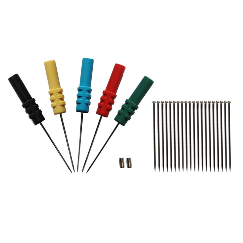 A set of four colorful plastic knitting needles with blue, yellow, red, and green handles, and a set of six black knitting needles with silver tips are displayed on a white background. | JRLink HT307 Back Pinning Probes Needle Piercing Probes Set 5 Assorted Colors | 2c0ca399d3fa8753061c05a674faab4d60ab8906770a602cda6d2c613072d103 | 001229695840 | 0 | 0 | 32 | 12 | 0 | 0 | |