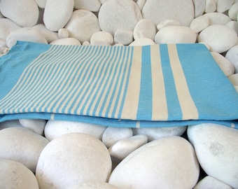A blue and white striped towel is neatly folded on a pile of smooth, rounded stones. The stones are of various sizes and are arranged in a way that creates a natural, textured surface. The towel is placed in the center of the image, with the stripes running vertically. The background is a gradient of light to dark, sug... | Turkishtowel-High Quality Hand Woven Turkish Cotton Bath,Beach,Pool,Spa,Yoga Towel or Sarong-Natural Cream Stripes on Turquoise | fa3bf165d034433829b8c6767a4be6f5ed6d4fade55c6d341b0933cfdd295df7 | 001229695801 | 0 | 0 | 69 | 14 | 0 | 0 | |
