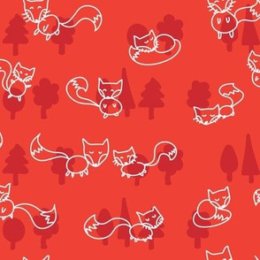 A pattern of various cartoon foxes in different poses and sizes is spread across a red background. The foxes are illustrated in a simple, line-drawn style with black outlines and white fill. They are surrounded by stylized trees and foliage, also in black and white. The overall design has a playful and whimsical feel. | foxes doodle_white on red | fbada3b25d6a1008edf2fab0d97a894b44f2df5c058293ea112c6e8e1dbe53b2 | 001229695802 | 0 | 0 | 54 | 4 | 0 | 0 | |