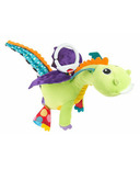 A plush toy of a green dinosaur with a purple and orange mane and tail, wearing a blue and red hat, and a purple cape with a red and blue emblem on the back. The dinosaur has a white belly and is standing on a colorful striped base. | Lamaze Clip and Go Flip Flap Dragon | cef038e0ef8d76d6d5fa860205281d0fba40a82b56dd9a3e69366f7d5a1dc085 | 001229696267 | 0 | 0 | 48 | 7 | 0 | 0 | |