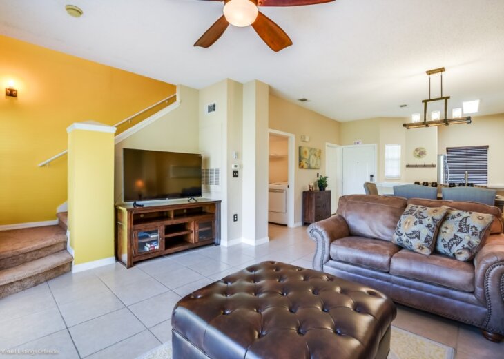 A spacious living room with a large brown leather couch, a brown leather ottoman, and a wooden coffee table. The room has a flat-screen TV on a wooden stand, a staircase with yellow walls, and a ceiling fan. There is a potted plant near the TV and a clock on the wall. | Affordable! Close to Disney! Emerald Island 3BD/3BA Balcony #10 | c87d9babd7b06cf3c6f98eb7452aaef3e24a3809fc321c4144fc0d1e5fe844c5 | 001229696303 | 0 | 0 | 52 | 9 | 0 | 0 | |