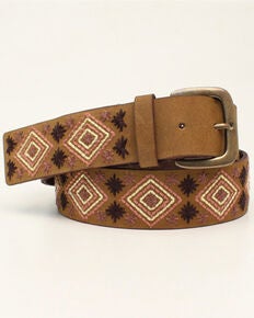 A brown leather belt with a geometric pattern is displayed against a white background. The belt features a central buckle with a circular design and a metal buckle closure. The pattern consists of various shapes, including triangles and circles, in shades of brown and beige, creating a decorative and textured appearanc... | M & F Western Women's Diamond Embroidered Belt , Brown, hi-res | e3c4ed11d5393667b8d072a3f992fed6198f381ca3fc8a1d0fc5e66092e5467e | 001229696202 | 0 | 0 | 51 | 11 | 0 | 0 | |