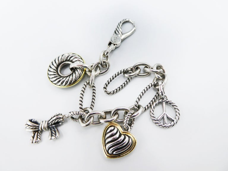 A silver heart-shaped charm with a zebra pattern engraved on it is attached to a silver chain. The charm is part of a larger silver chain with various other charms, including a bow, a leaf, and a heart-shaped charm with a bow. The charms are arranged in a way that the heart-shaped charm with the zebra pattern is promin... | Contemporary David Yurman Madison Charm Bracelet Cable Sterling Silver Gold Two-Tone | b80258578d7e54cd24f0717265892396d66bc534958b7fdaf3c41dee93206c82 | 001229696869 | 0 | 0 | 63 | 11 | 0 | 0 | |