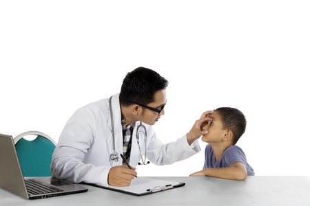 A doctor is examining a young boy's eyes in a clinical setting. The doctor is wearing a white coat, a stethoscope around his neck, and glasses. The boy is seated on a green chair, looking up at the doctor. On the table, there is a clipboard with a pen on it, and a laptop is placed to the left of the doctor. The room is... | Foto de Image of young male pediatrician is checking his patient eyes, isolated on white background - Imagen libre de derechos | 24f4fca8d51d1f86d29a97a238d160bb03a2573e17573c4aed254bed2de28269 | 001229696915 | 0 | 0 | 70 | 21 | 0 | 0 | |